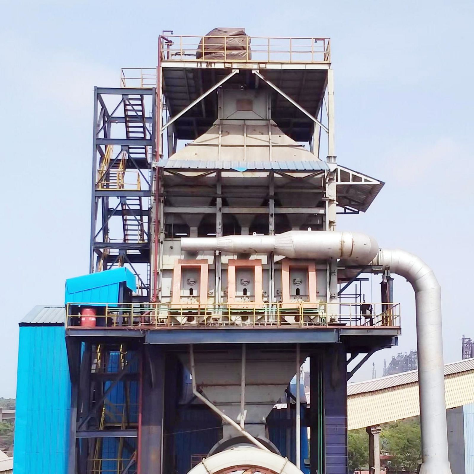 豎式預(yù)熱器和豎式冷卻機為河南鄭礦機器專利技術(shù)產(chǎn)品,具有入窯物料預(yù)熱效率高和出窯石灰冷卻效率高等特點,產(chǎn)品單耗底、節(jié)能,節(jié)省場地面積。石灰活性高,白度好,均勻穩(wěn)定。窯尾出預(yù)熱器廢氣采用機力空冷機,大幅降低入收塵器廢氣溫度,同時布袋收塵器入口加裝冷風(fēng)口,做應(yīng)急使用,防止異常情況下高溫氣體燒壞收塵濾袋。