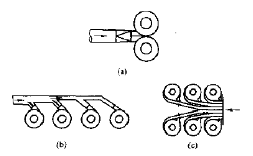 圖(a)是最簡單的入口并聯(lián)方式,在進氣管中氣體和灰塵的流動是對稱的,兩個除塵器中的工作情況相同,效率和阻力相同;圖(b)所示連接,難以保證所有支管入口壓力相同,但安裝比較方便;圖(c)每經過一個除塵器的入口之后,主管道就會縮小一些,進入并聯(lián)的除塵器氣流可以自我補償,達到氣流基本平衡;