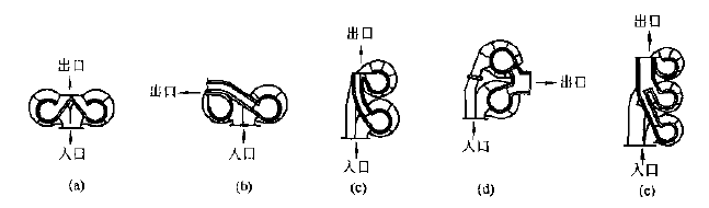 2.2排氣管并聯(lián)方式,并聯(lián)除塵器與排氣干管連接時,往往為了回收壓力而采用蝸卷式出口。因為這種出口的方向可以隨意安排,故可根據具體情況采用不同的連接方式,見圖二。